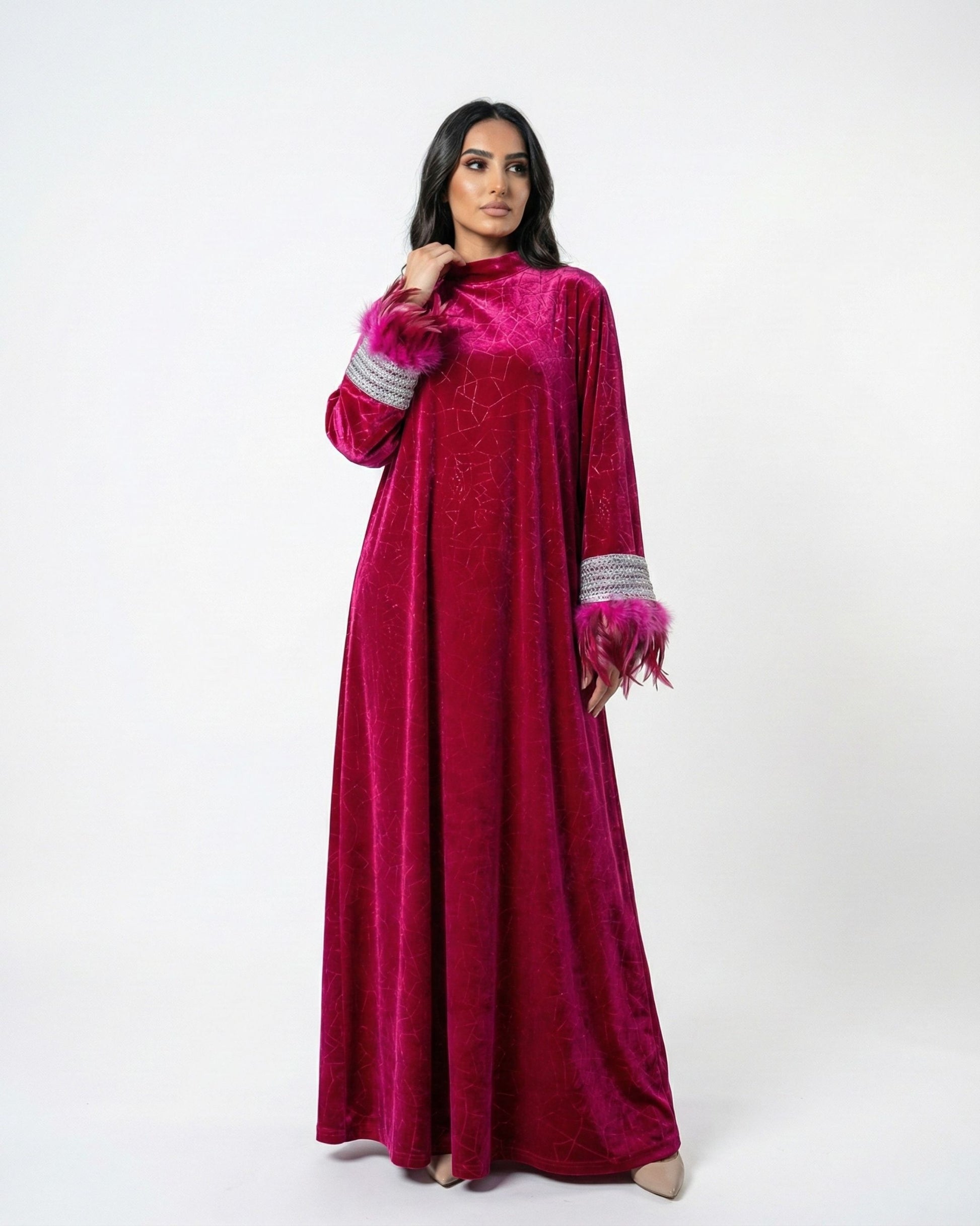 Ruby Aurora captures a regal warmth, radiating a glow that is both commanding and deeply inviting. This piece is crafted from plush luxury velvet in a vibrant jewel-toned fuchsia, offering a drape that feels heavy, rich, and protective. A subtle, embossed geometric texture runs through the fabric, adding a modern tactile depth to the classic velvet finish. The design is defined by its striking sleeves, where wide bands of intricate silver metallic lace meet ethereal feather accents that flutter softly with every gesture. It moves with a dignified grace, balancing the boldness of its color with the softness of its details. Ruby Aurora is designed for the woman who embraces her own radiance, blending timeless glamour with a spirited, contemporary edge.